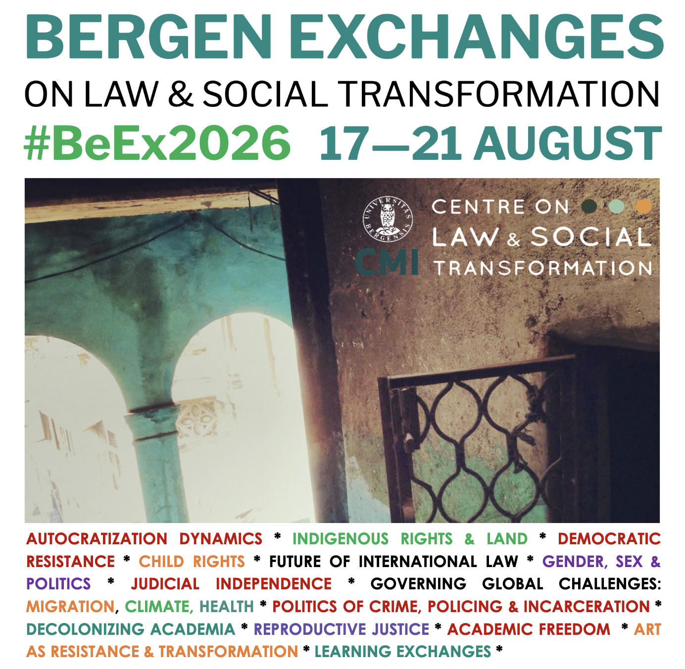 Join scholars, activists, legal professionals, and artists from around the world for the 2026 Bergen Exchanges on Law & Social Transformation, a five-day international conference exploring the intersections of law, power, and resistance. Hosted across Bergen’s vibrant cultural venues, the Exchanges feature cutting-edge debates, keynotes, roundtables, exhibitions and social gatherings.